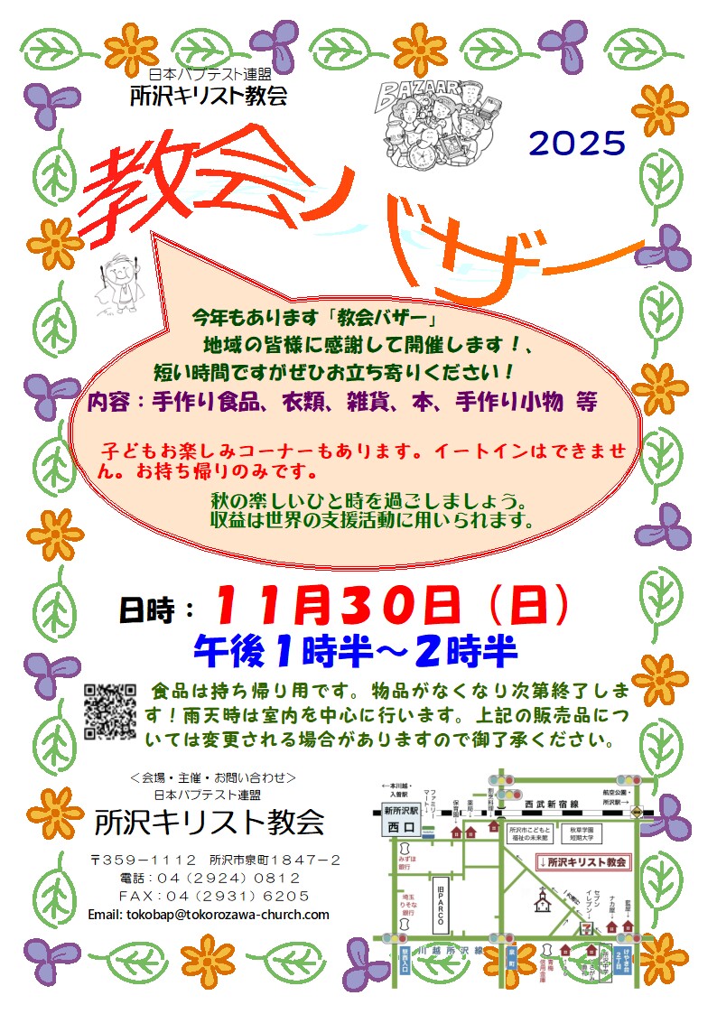 *所沢教会バザー…11月30日(日)13時半~14時半。当教会境内地や教会施設を利用して行います。掘り出し物多数。内容は上記チラシ参照