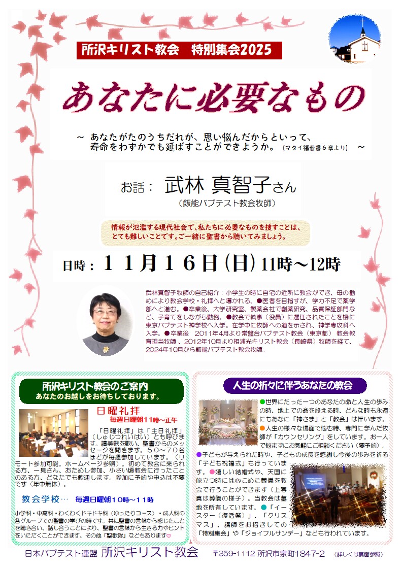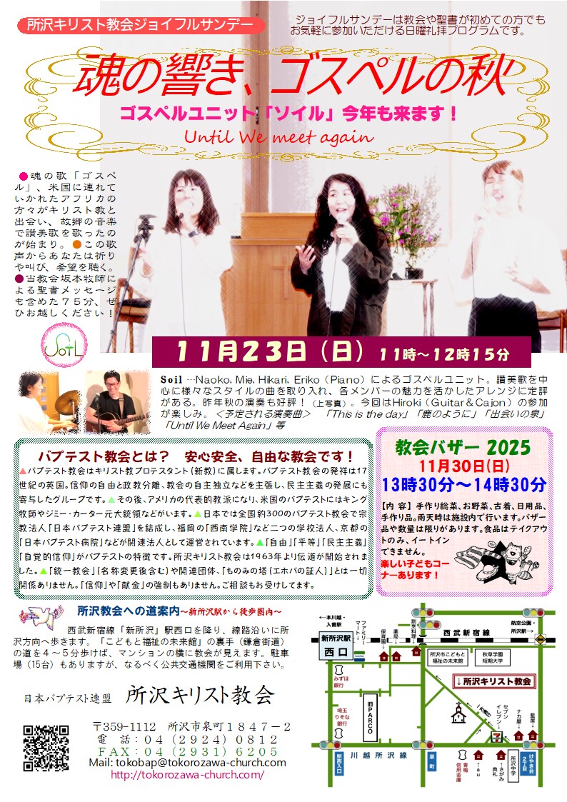*所沢教会バザー…11月30日(日)13時半~14時半。当教会境内地や教会施設を利用して行います。掘り出し物多数。内容は上記チラシ参照